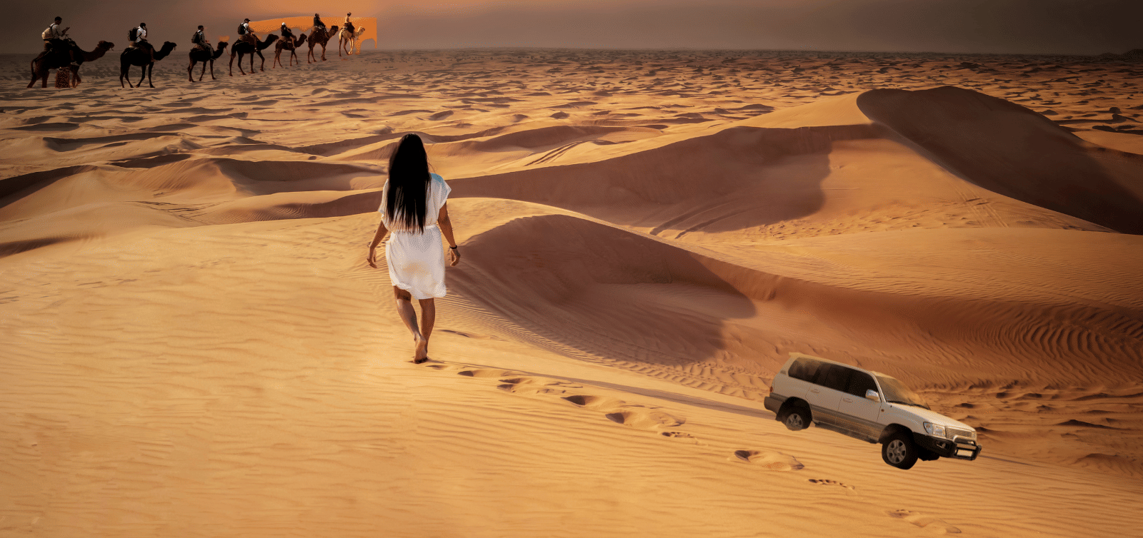 • BBQ dinner with unlimited soft drinks, sunset photo stop, experience, shisha, henna painting, and Tanoura and belly dance show